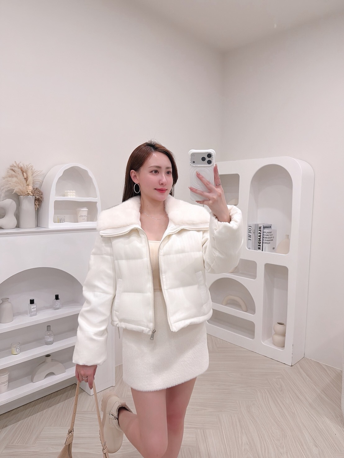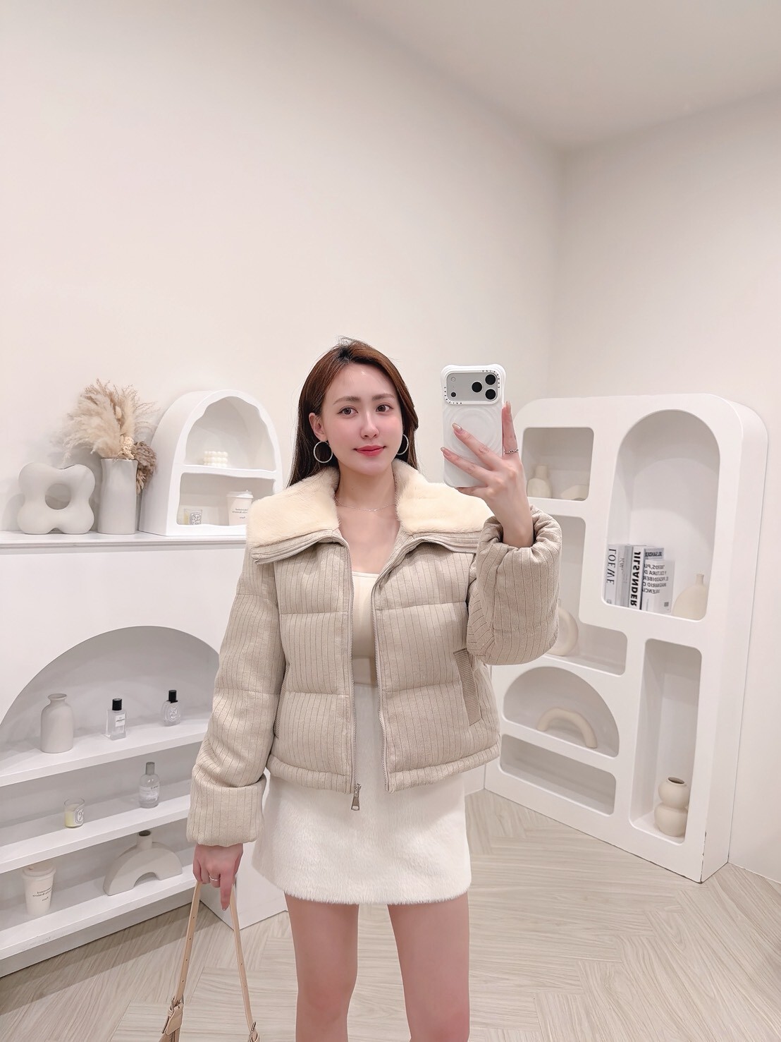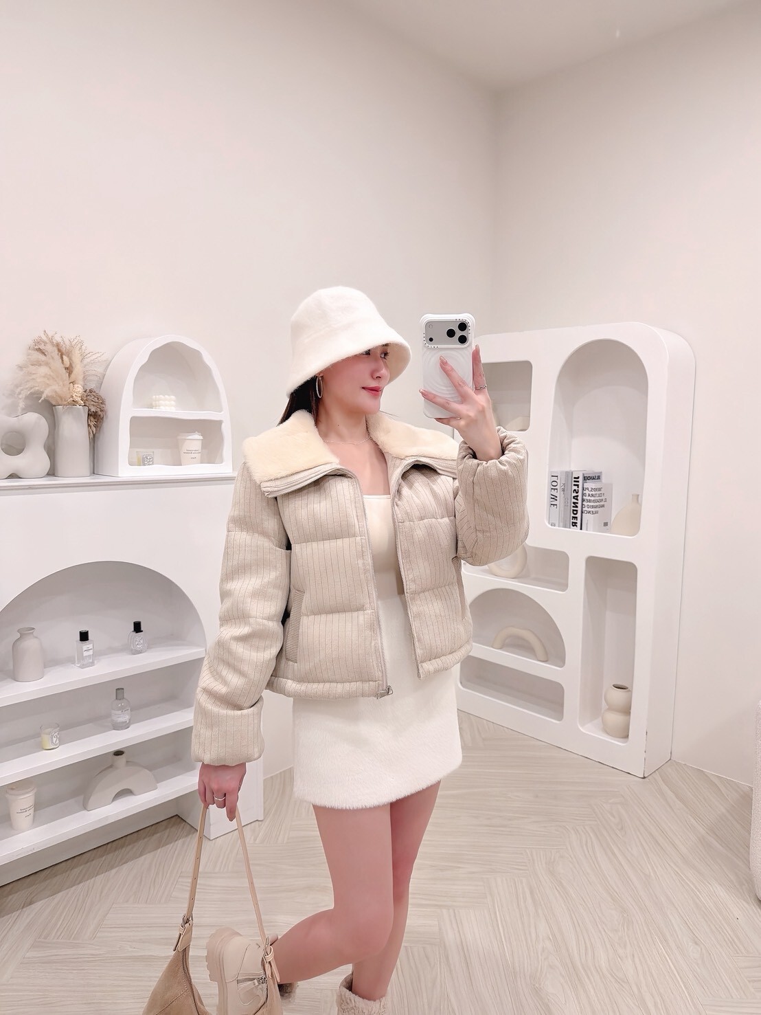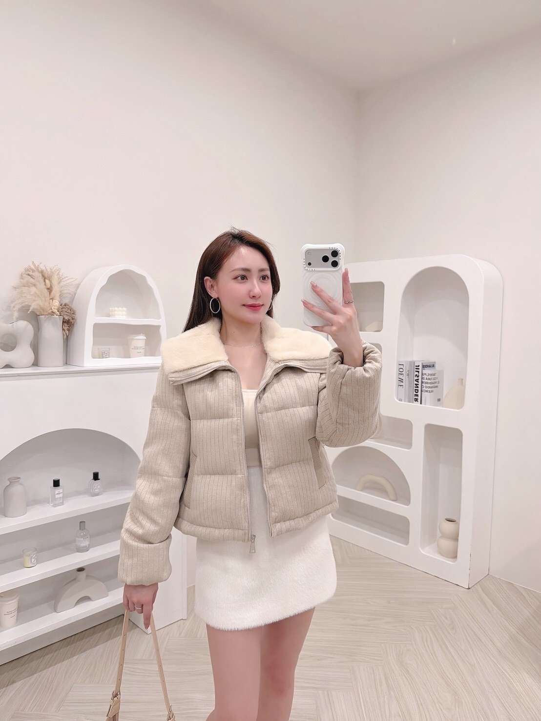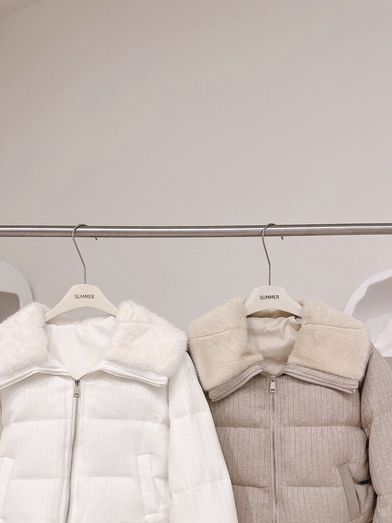 以柔和色調結合細緻絨毛領