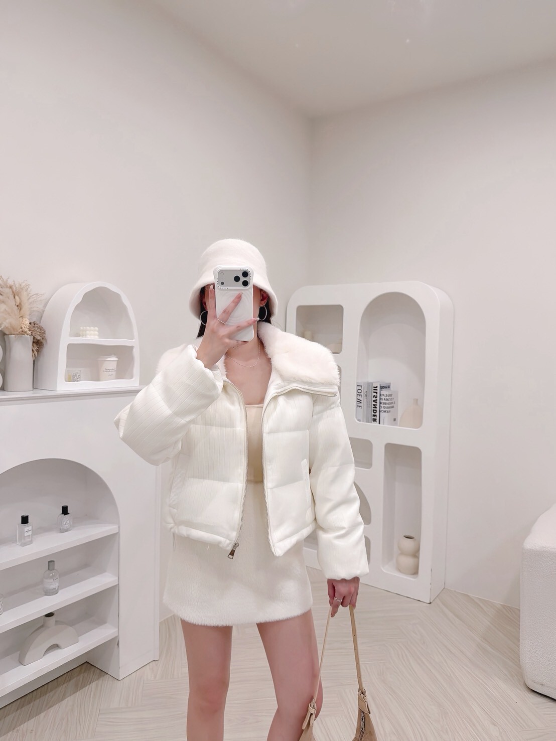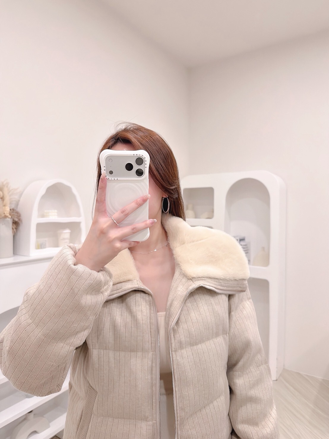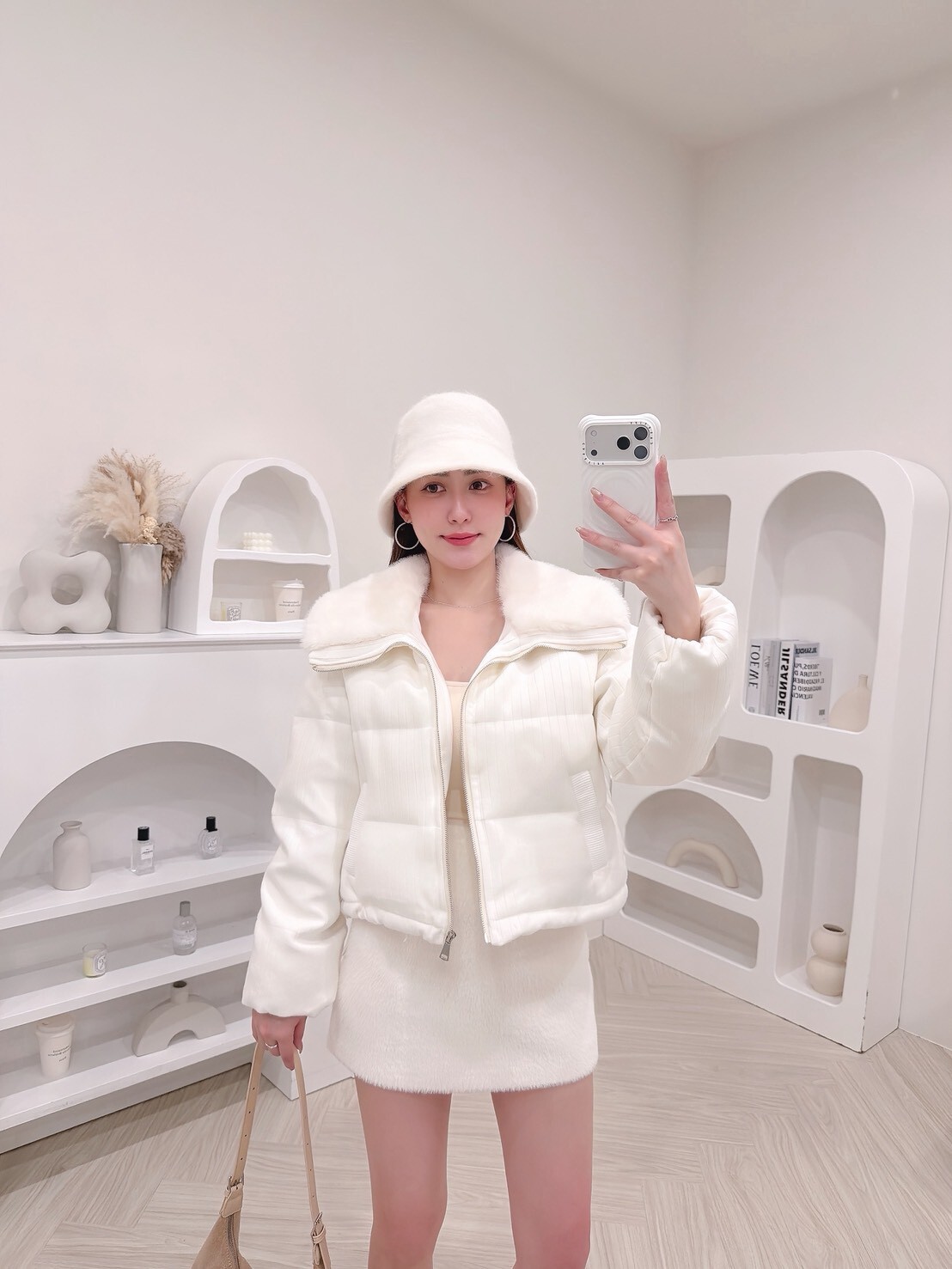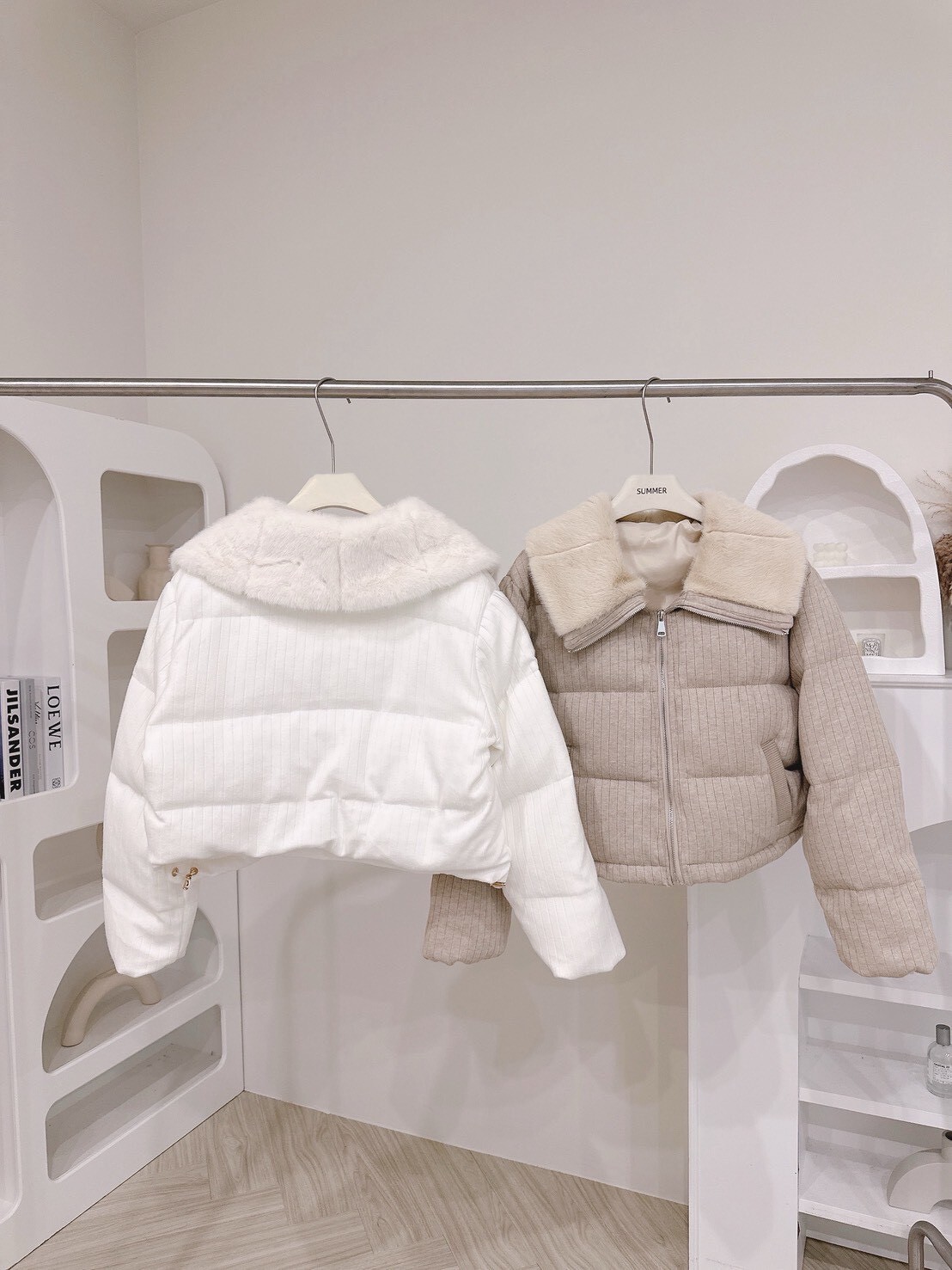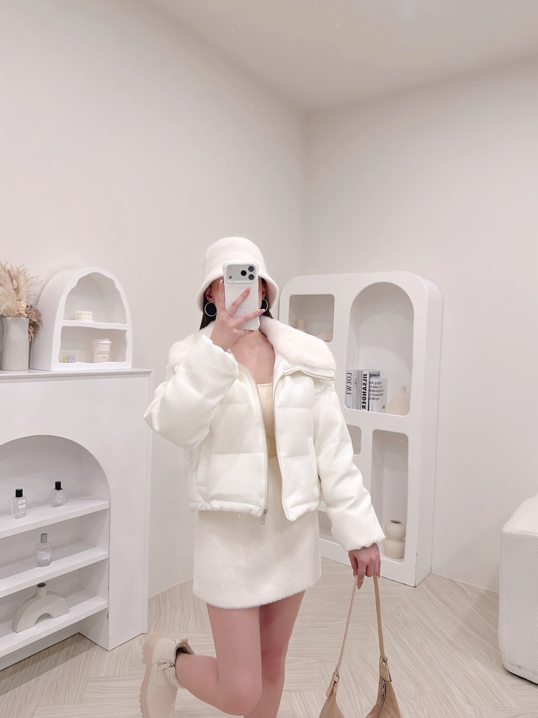 以柔和色調結合細緻絨毛領