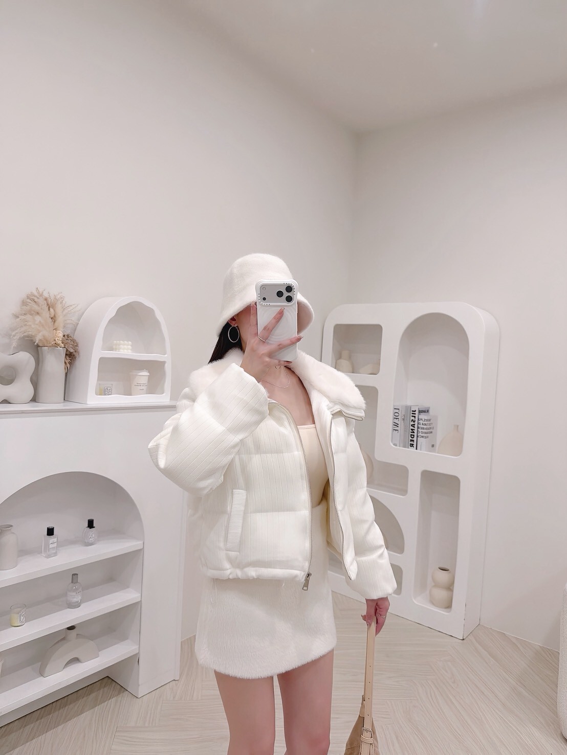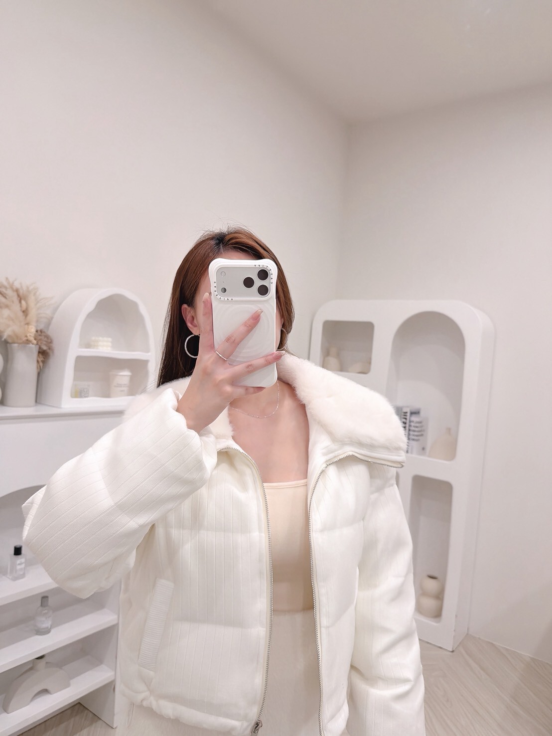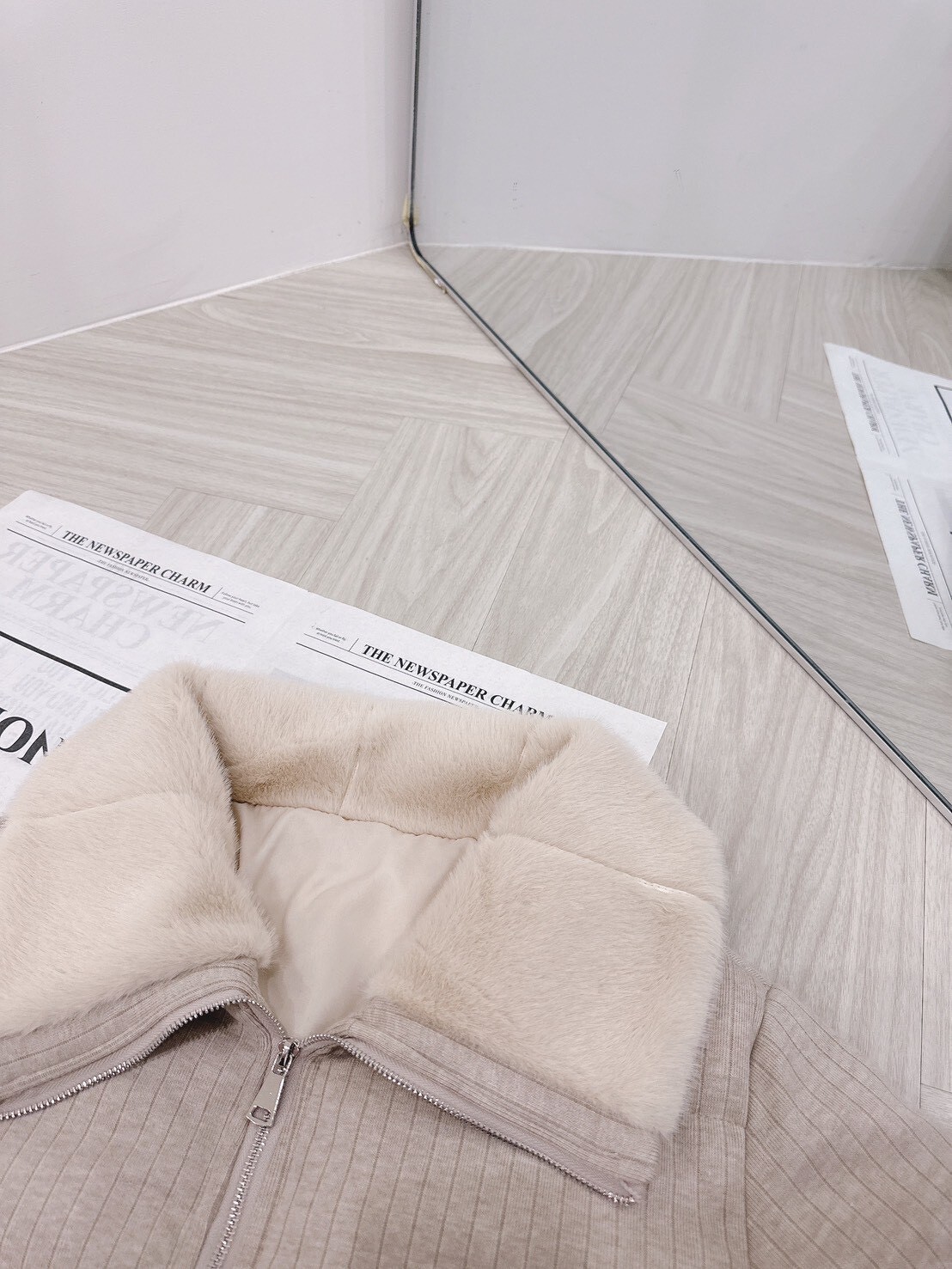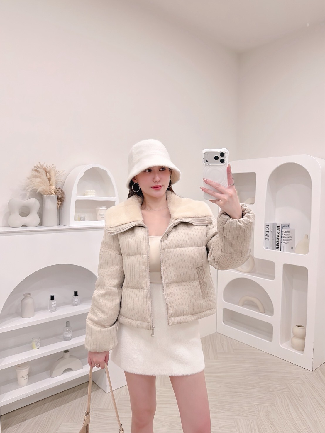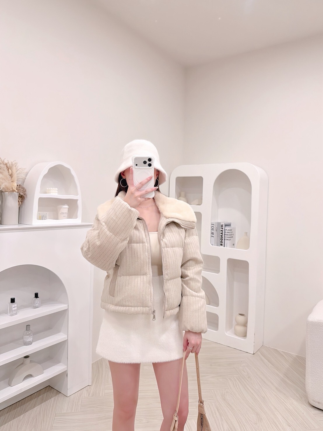 以柔和色調結合細緻絨毛領