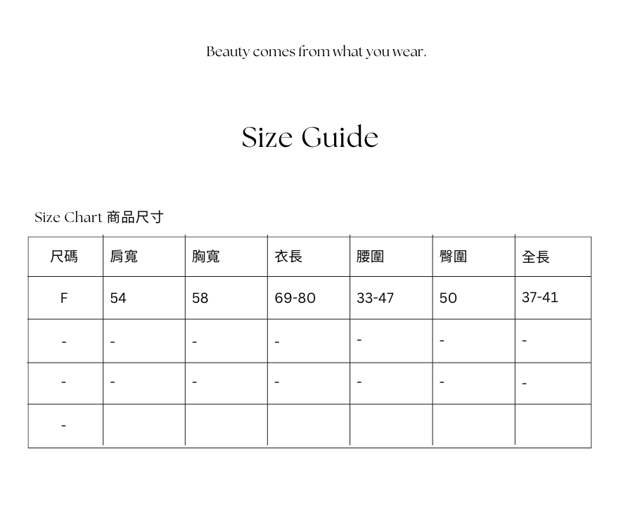 服飾因布料特性及各種因素,測量時會有1-2cm的誤差