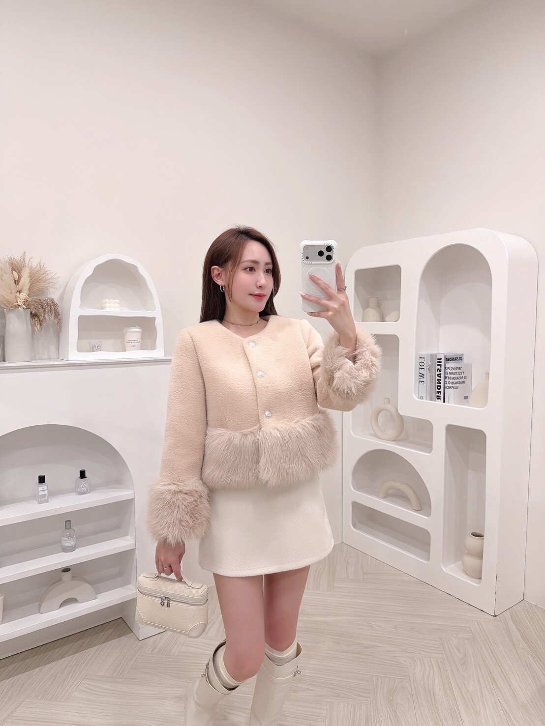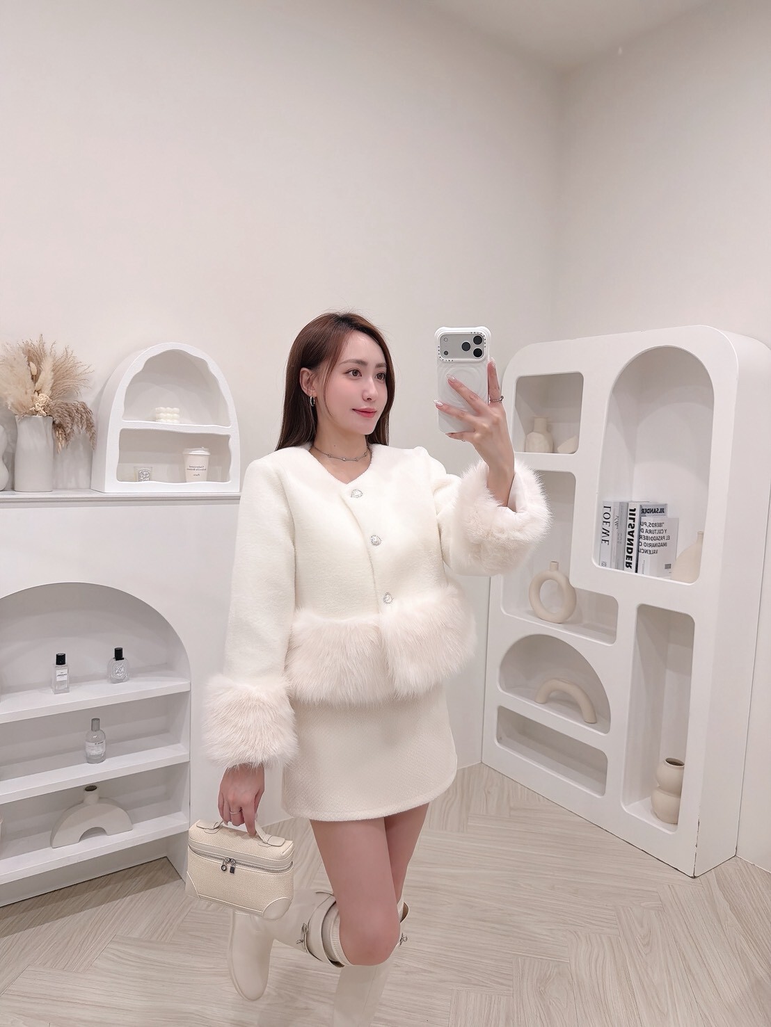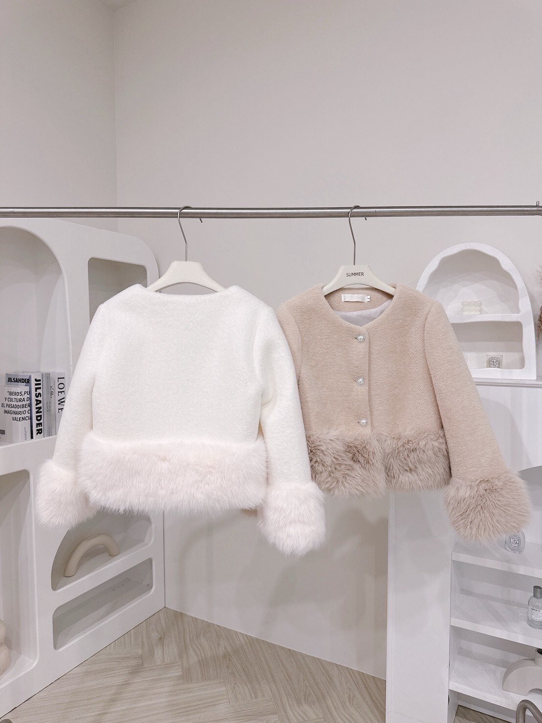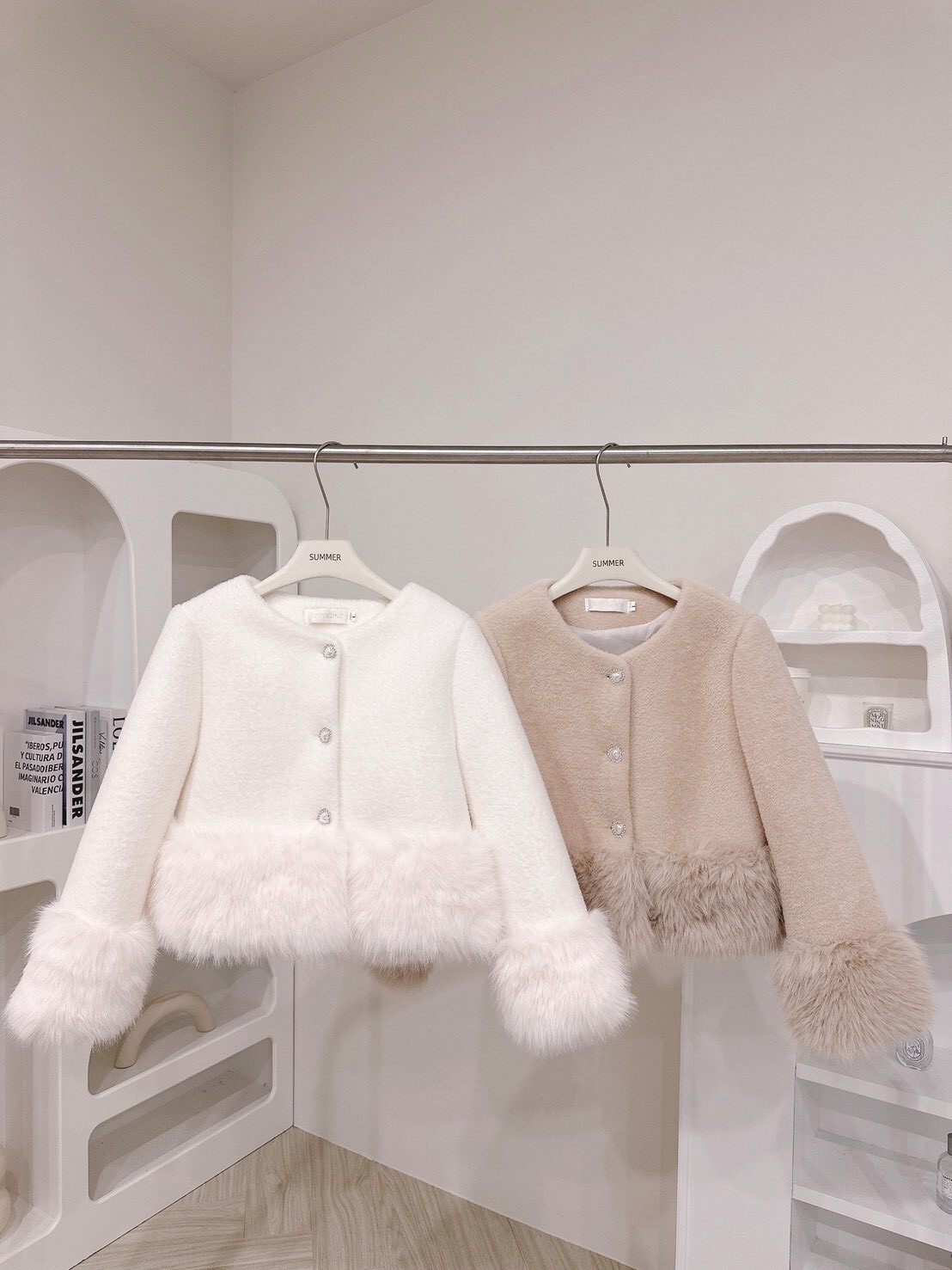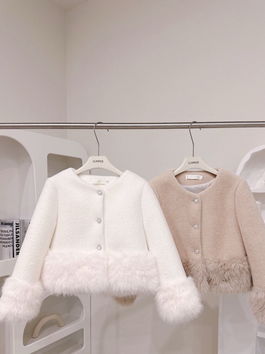 袖口與下擺絨毛拼接細節讓整體柔嫩又有造型感