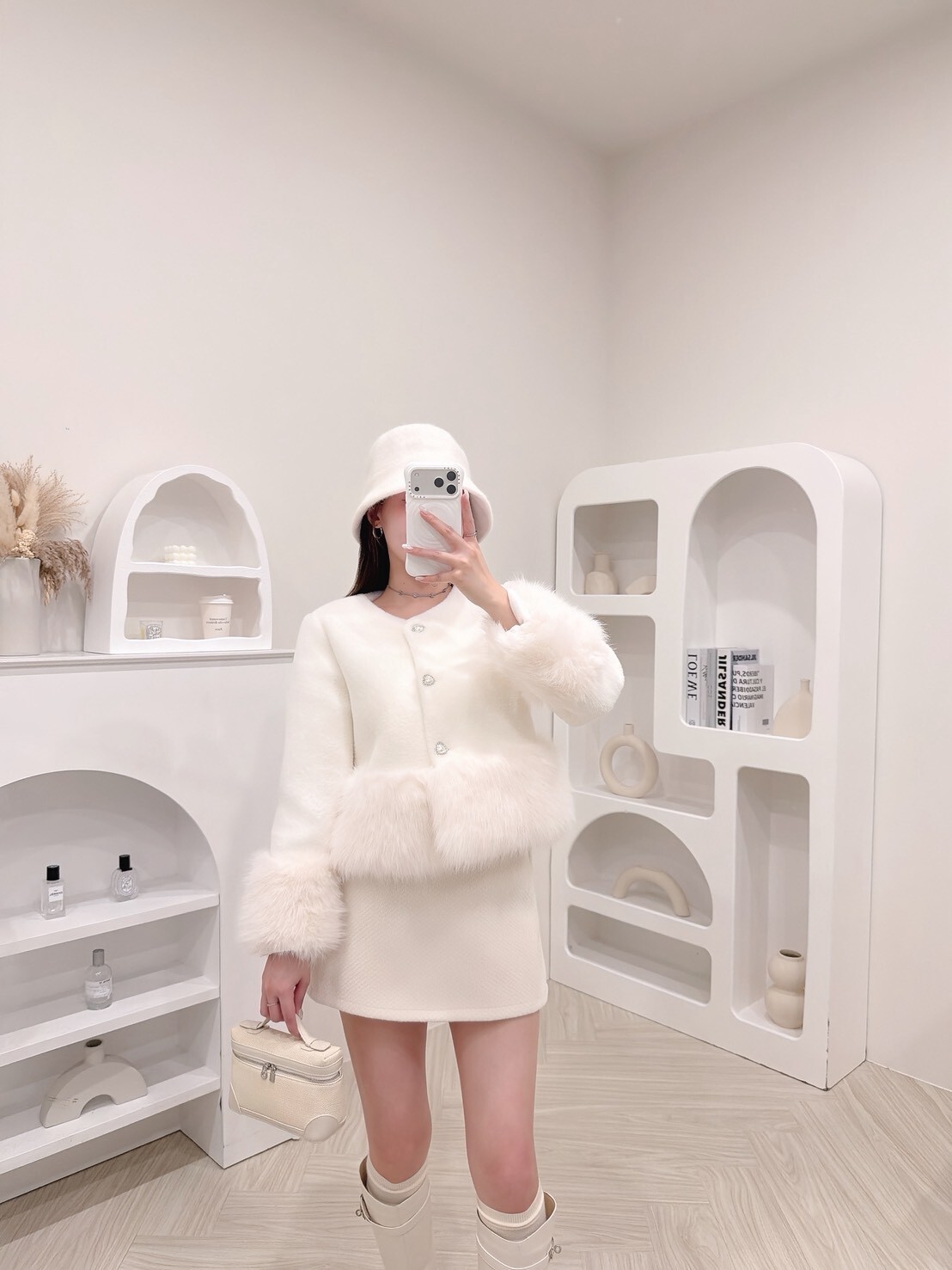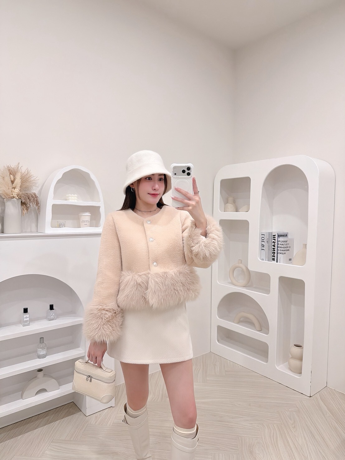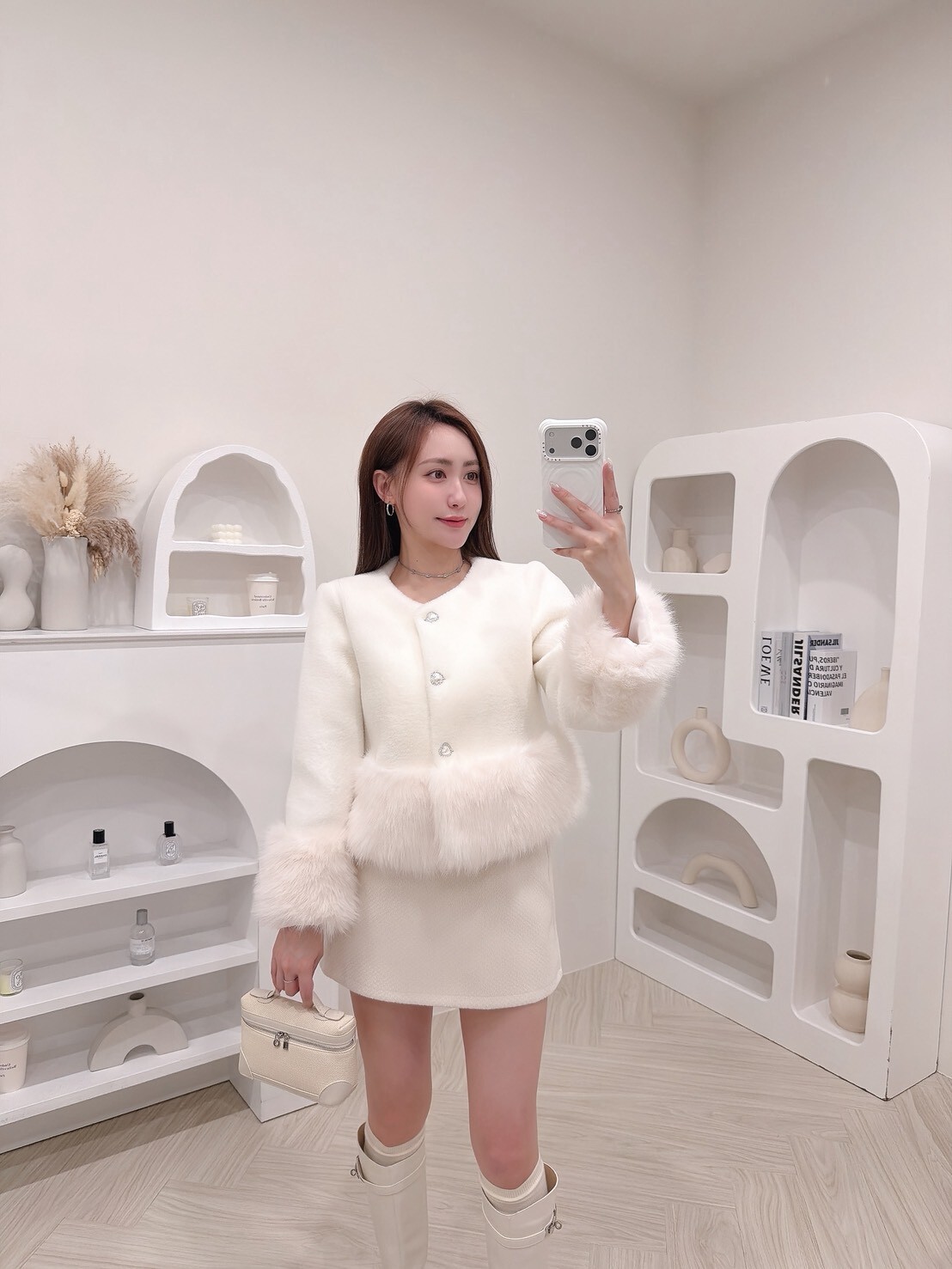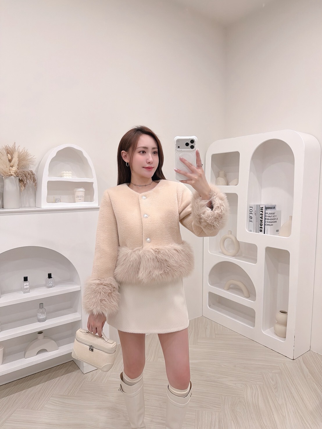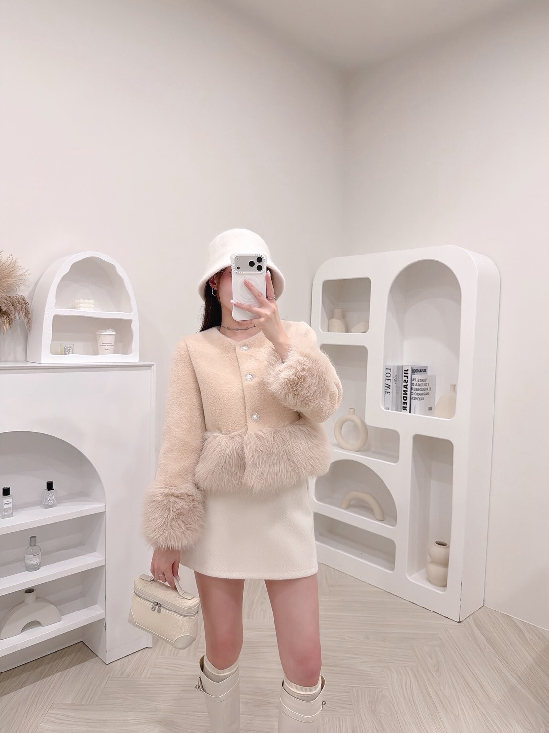 袖口與下擺絨毛拼接細節讓整體柔嫩又有造型感